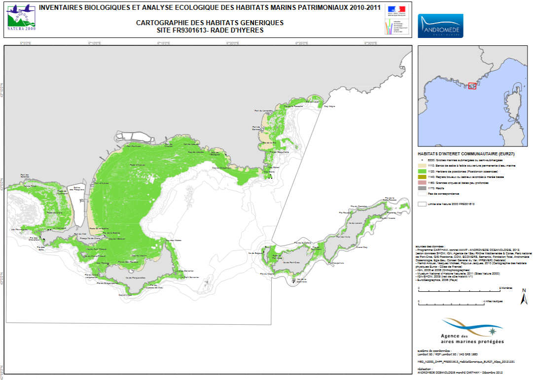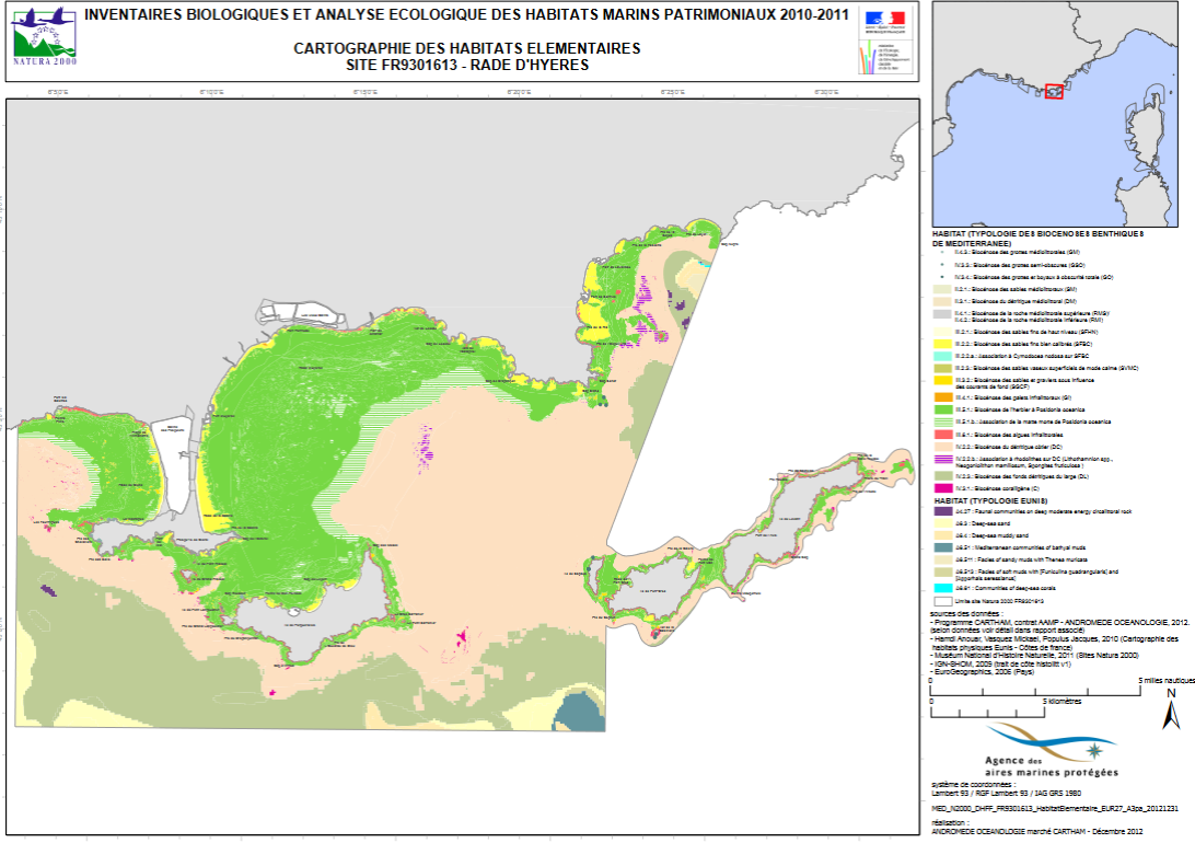 Cartographie des biocénoses marines sur le site Natura 2000 FR9301613 Rade d'Hyères réalisée par Andromède Océanologie en 2012 dans le cadre du programme CARTHAM lancé par l'Agence des Aires Marines Protégées.