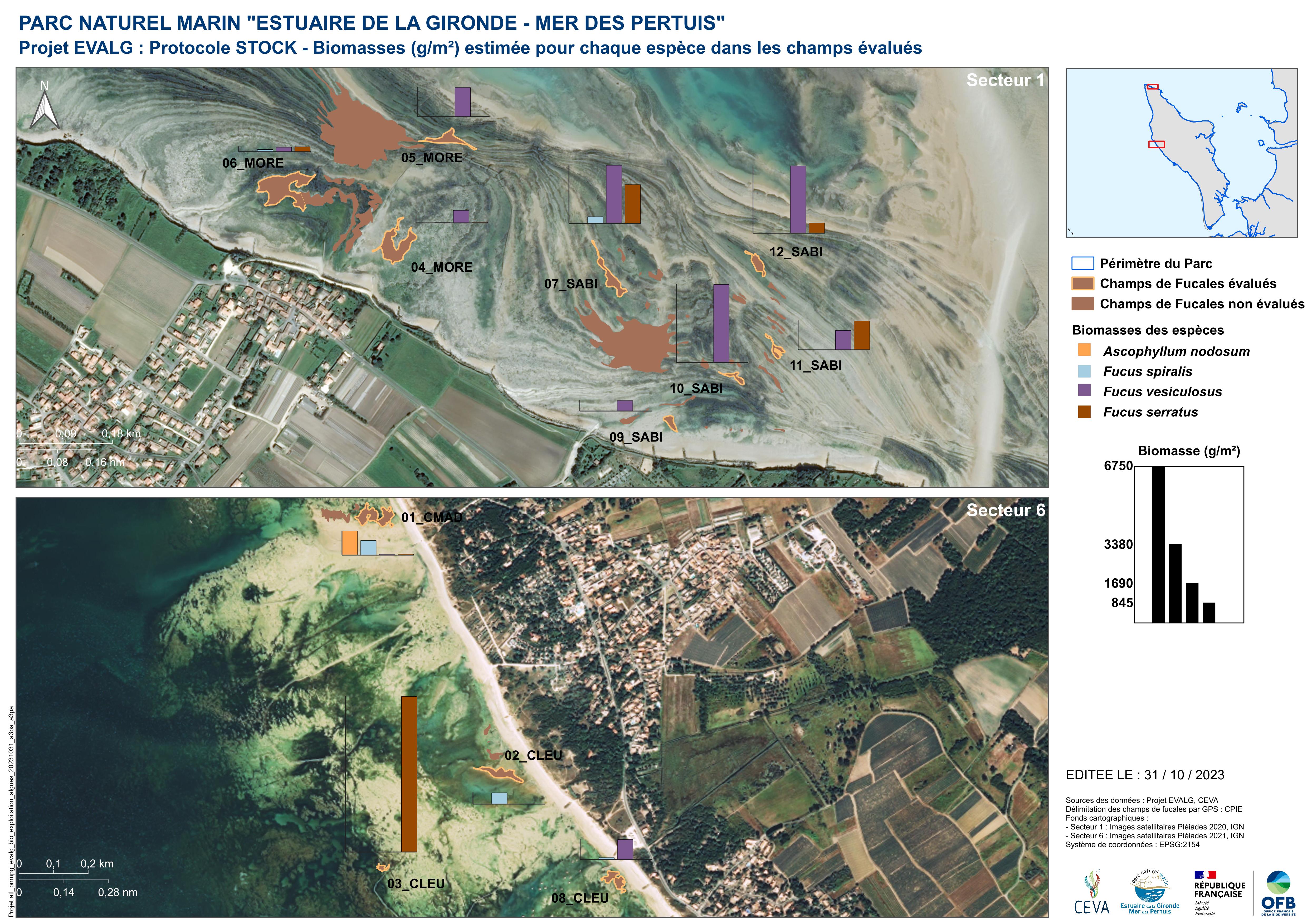 Le projet EVALG "Évaluation de l’état écologique et des stocks de macroalgues" au sein du Parc naturel marin "estuaire de la Gironde - mer des Pertuis", piloté par l’Office français de la biodiversité (OFB) et le Centre d'Etude et de Valorisation des Algues (CEVA) a été mis en place en décembre 2020. Ce projet prévoit :