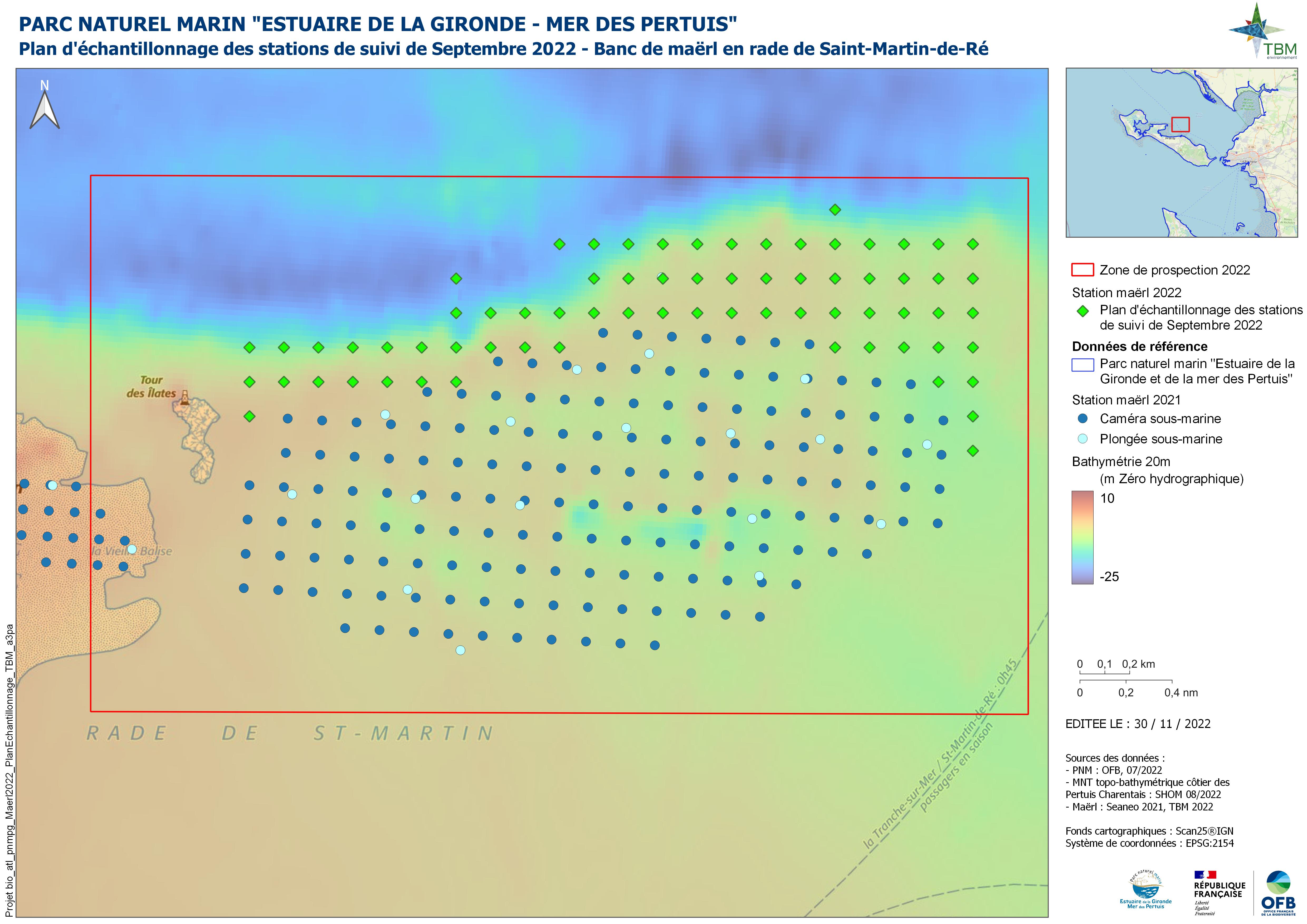 - 1. Analyse des données historiques de Sauriau 2012 (LIENSs) sur le secteur d'étude 2. Réalisation d'un plan d'échantillonnage pour les prospections caméra en bateau, Septembre 2022 en complément des prospections d'octobre 2021. 4. Réalisation des prospections en bateau (Navire "Bar'ouf" de TBM environnement, avec caméra sous marine) en Rade de Saint-Martin-de-Ré : 20 septembre 2022, 70 stations réalisés 5. Remise au propre et traitement bureau des données collectées en Septembre et Octobre 2022 6. Analyse des données caméra de Seano 2021
