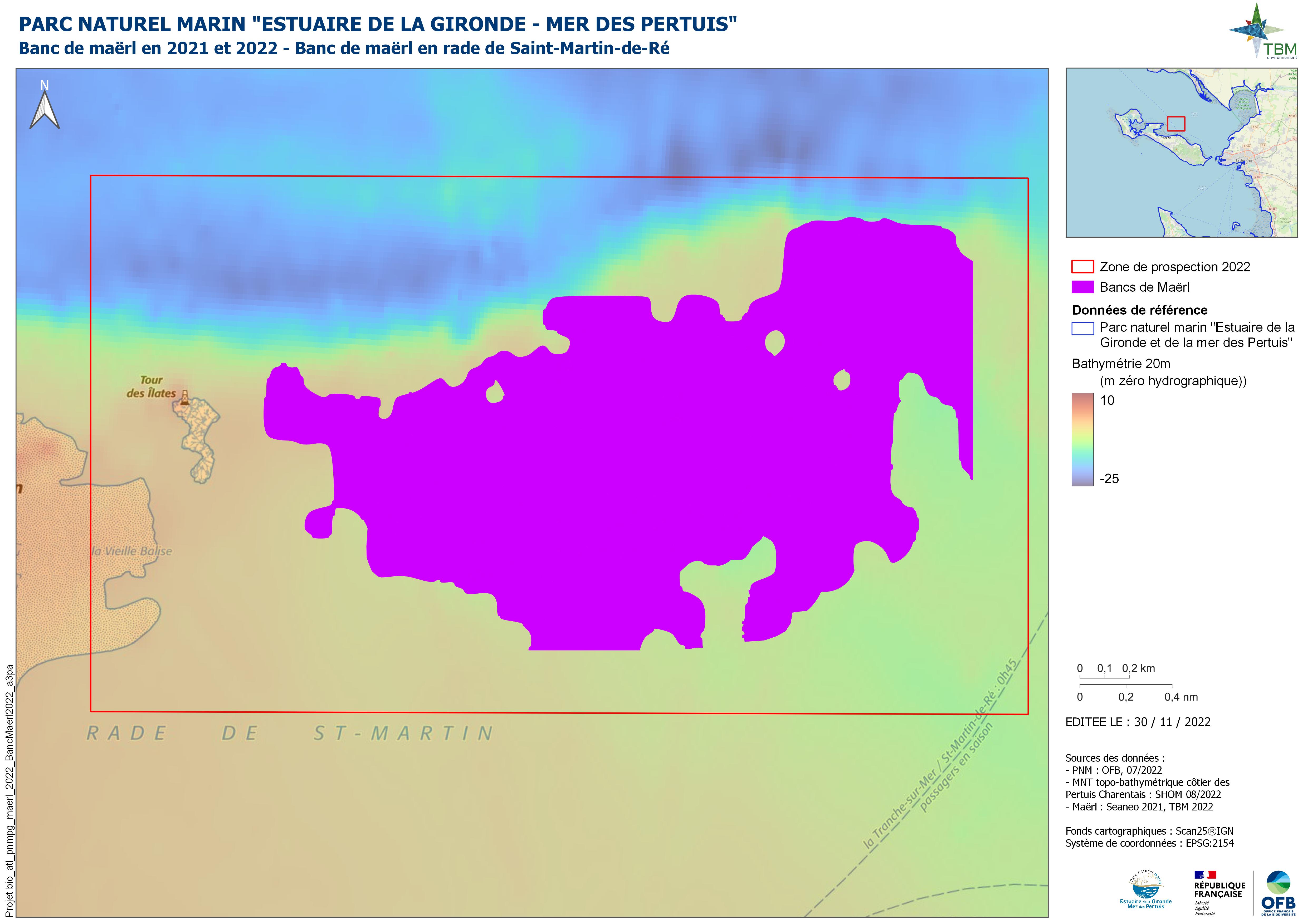 Cartographie du banc de maërl, au sein du Parc naturel marin "Estuaire de la Gironde et mer des Pertuis", en rade de Saint-Martin-en-Ré en 2021 et complémentée en 2022 sur le Banc du Rocha.