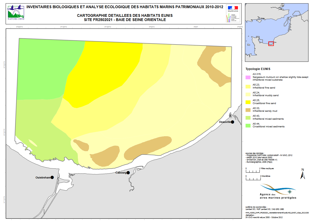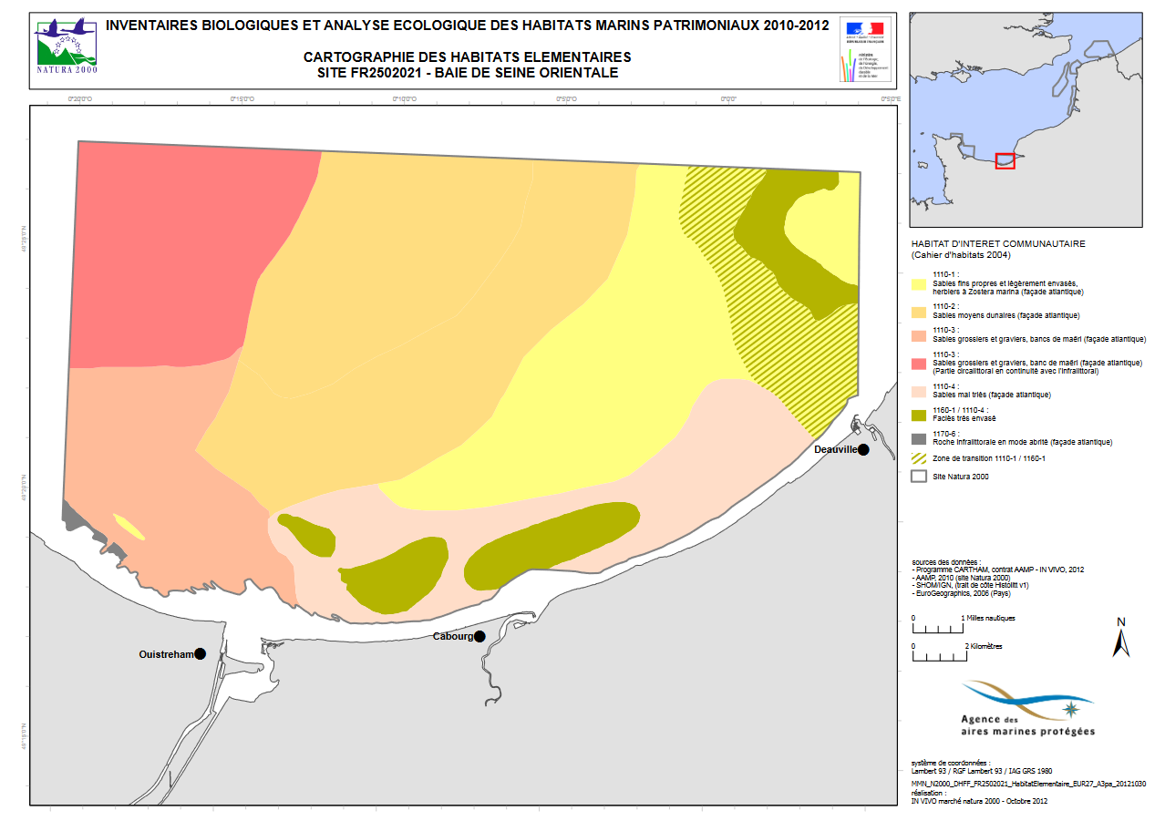 - Citation obligatoire dans la bibliographie de la référence suivante : "IN VIVO, 2012. Inventaires biologiques et analyse écologique des habitats marins patrimoniaux sur la zone Baie de Seine Orientale (FR2502021) du lot Natura 2000 en mer "Baie de Seine". Contrat IN VIVO / AGENCE DES AIRES MARINES PROTEGEES. 88p."